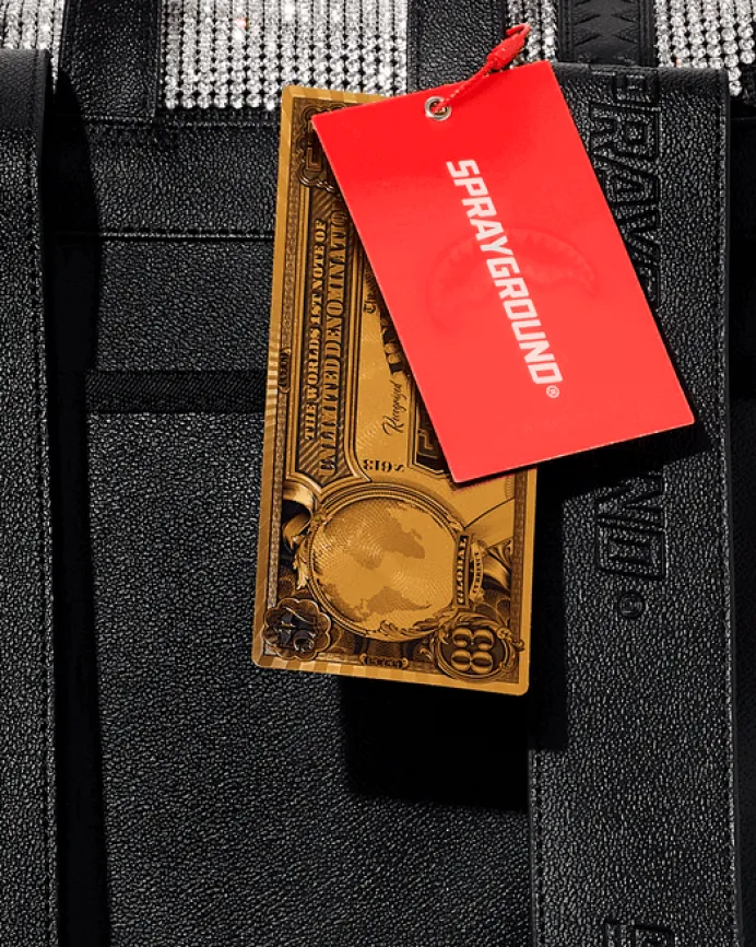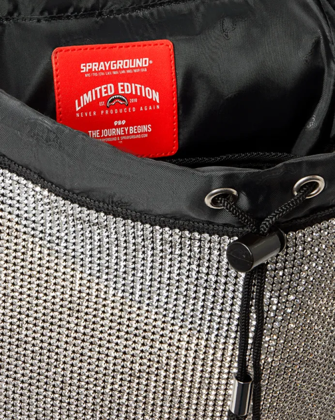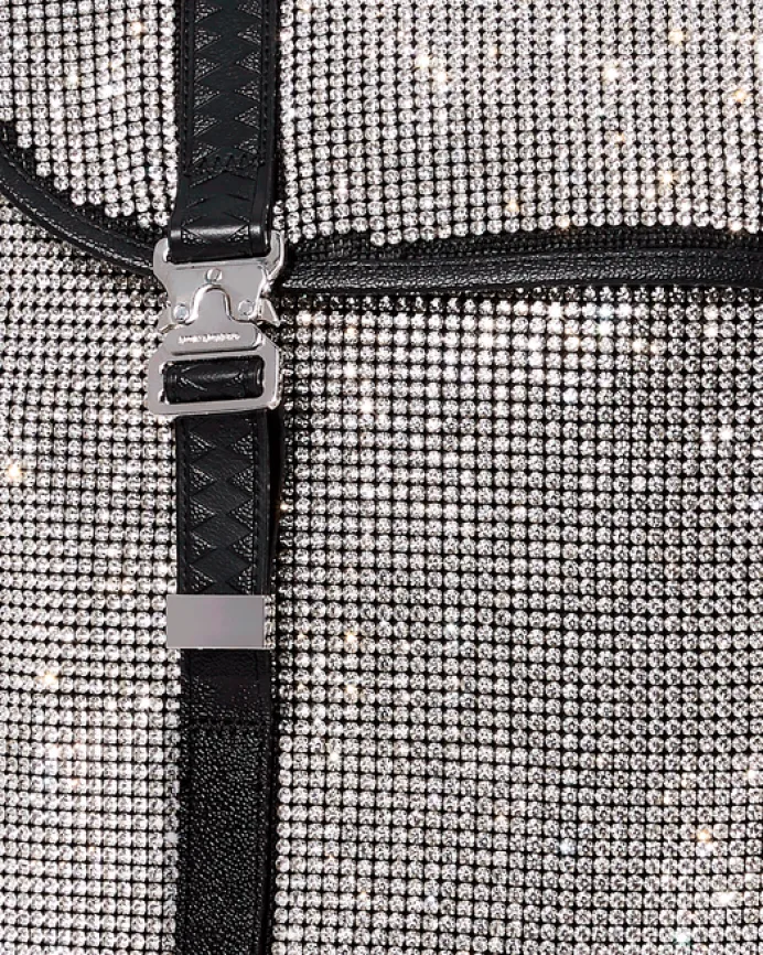 Our classic monte Carlo backpack with side cargo pockets Encrusted with rhinestones Featuring silver hardware and black Trims 100% FAUX LEATHER PRODUCT DETAILS Exterior Dimensions: 18" x 6" x 11.5" • Top Flap opening w/ adjustable metal enamel buckles and drawstring closure • Two side cargo pockets with metal e