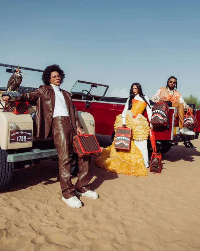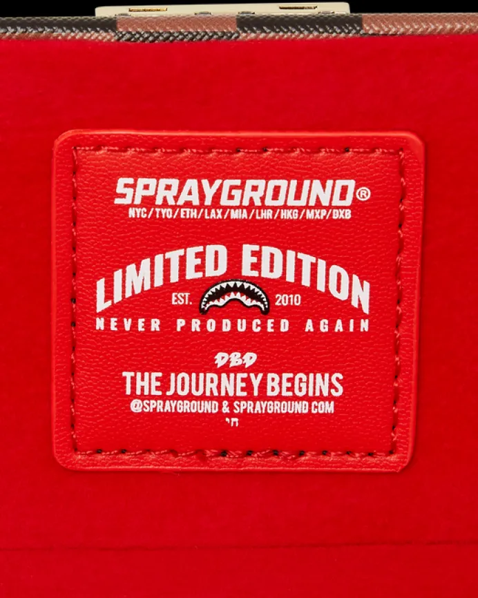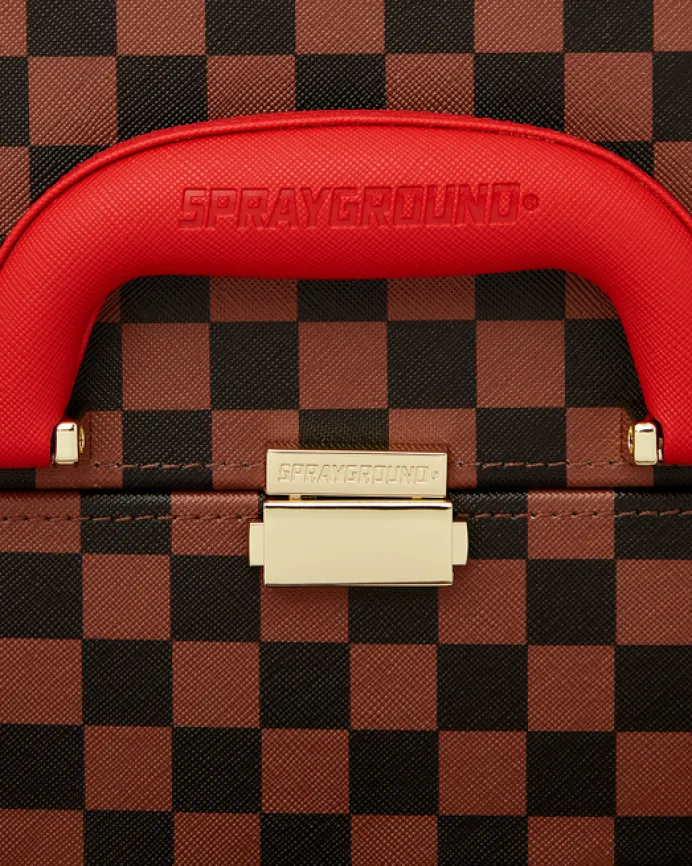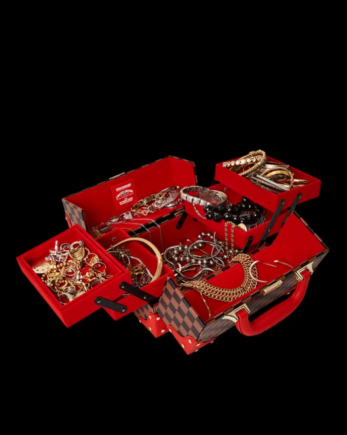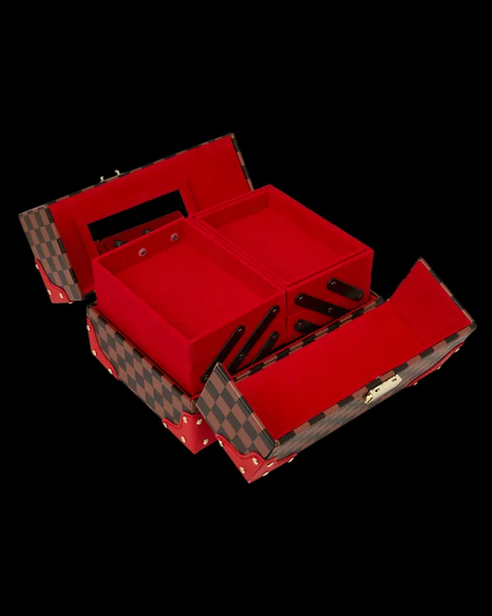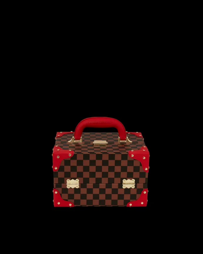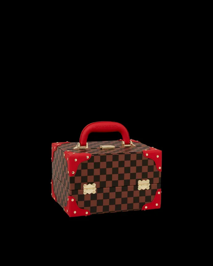 PRODUCT DETAILS: Red Trims with Special Gold Hardware details 100% PU – embossed with Sprayground monogram Size: 11" x 7" x 7" Red velour lining, Tiered shelving, removable tray, interior mirror.