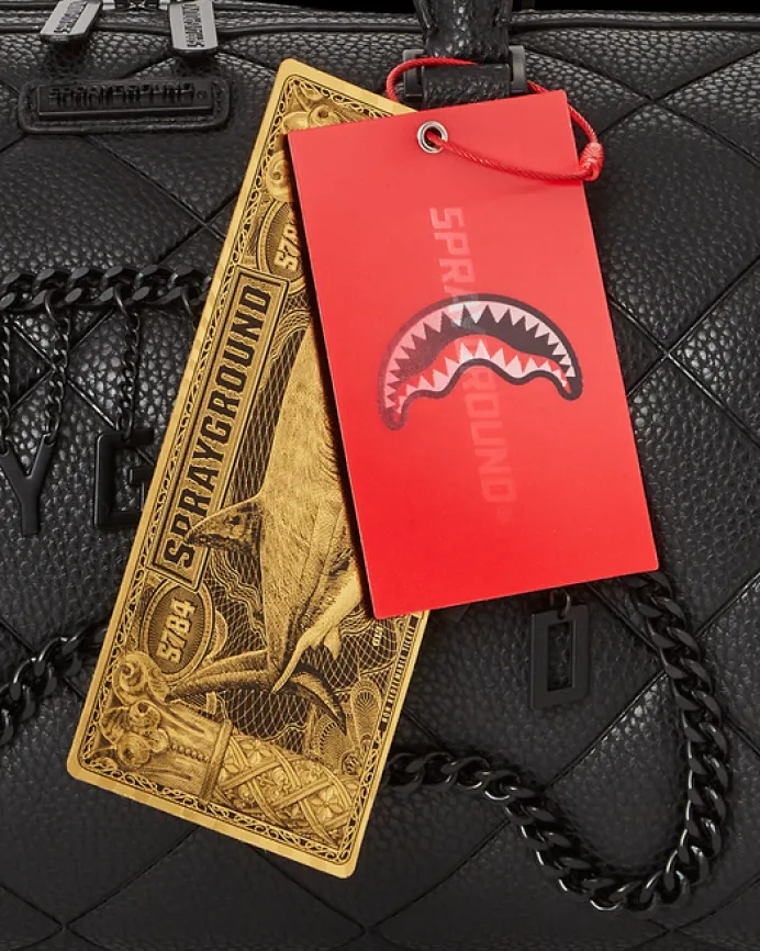 PRODUCT DETAILS 100% PVC quilted black faux leather featuring black chain hardware and hanging charm logo. 100%FAUX LEATHER Dimensions: 8" x 7.5" x 13"• Metal zipper pocket•Back Zippers •Zippered sneaker pocket • gold zippers • Adjustable Straps for custom sizing •Metal Zippers with Metal Hardware • bag of Sp