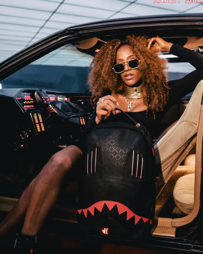 Travel back to the 80’s with the exclusive KITT shark backpack! Light up with interior on/off button with running led display “Knight Rider x Sprayground” PRODUCT DETAILS Has all the basic features as a regular DLX PVC backpack 100% PVC Embossed Textured Fabric Details Cut & Sewn Shark Mouth LED running sc