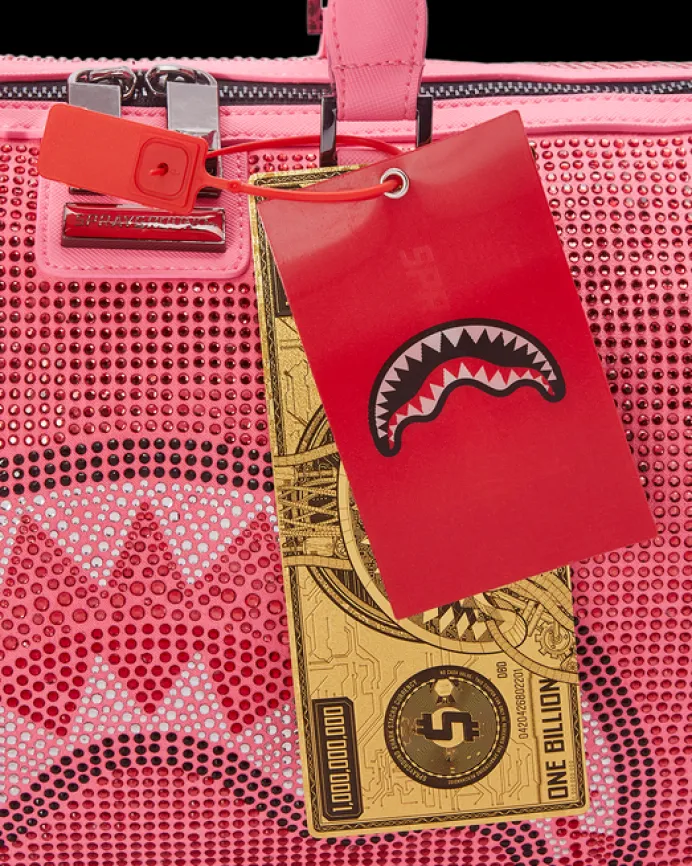 PRODUCT DETAILS CRYSTAL EMBELLISHMENT Exterior Dimensions: 8" x 7.5" x 13" • Zippered top opening • Zippered pocket on back panel • Zippered side pocket • Removable adjustable strap for custom sizing with reinforced crossbody construction • Logo embossed shoulder pad for comfort • Gold zippers with metal hardwa