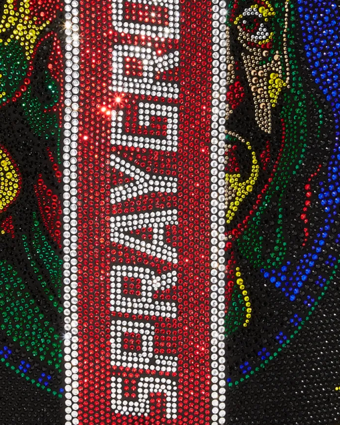 100% Polyester Embellished with vibrant multi color crystals PRODUCT DETAILS Exterior Dimensions: 18" x 6" x 11.5" • Front zipper pocket • Side pockets • Zippered Stash pocket • Separate velour sunglass compartment • Ergonomic mesh back padding • Adjustable Straps for custom sizing • Gold zippers with metal ha